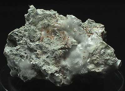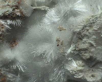4.8 x 3.8 x 2.1 cm Specimen with thick sprays of beautiful, white acicular artinite interspersed with massive orange desautelsite.